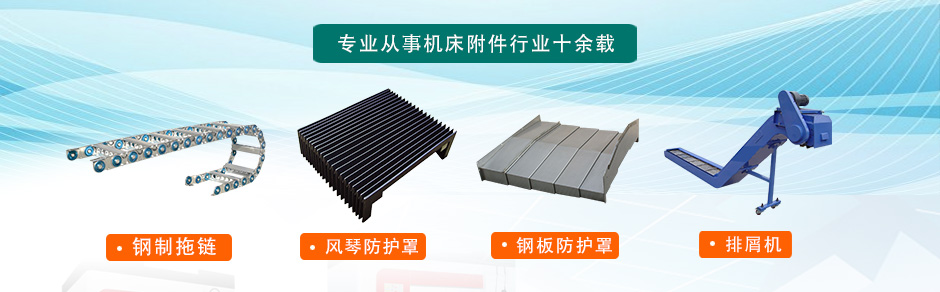 主要產(chǎn)品有:鋼板、不銹鋼板導軌防護罩、柔性風琴式導軌防護罩、不銹鋼片盔甲防護罩、伸縮式絲杠防護罩、油缸氣缸保護套、螺旋鋼帶保護套、卷簾伸縮防護罩、鋁型材防護簾、排屑機、機床工作燈、機床墊鐵、可調(diào)塑料冷卻管、金屬冷卻管、機床導軌刮屑板、T型撞塊槽板、塑料法蘭蓋、鋼管護帽等產(chǎn)品。